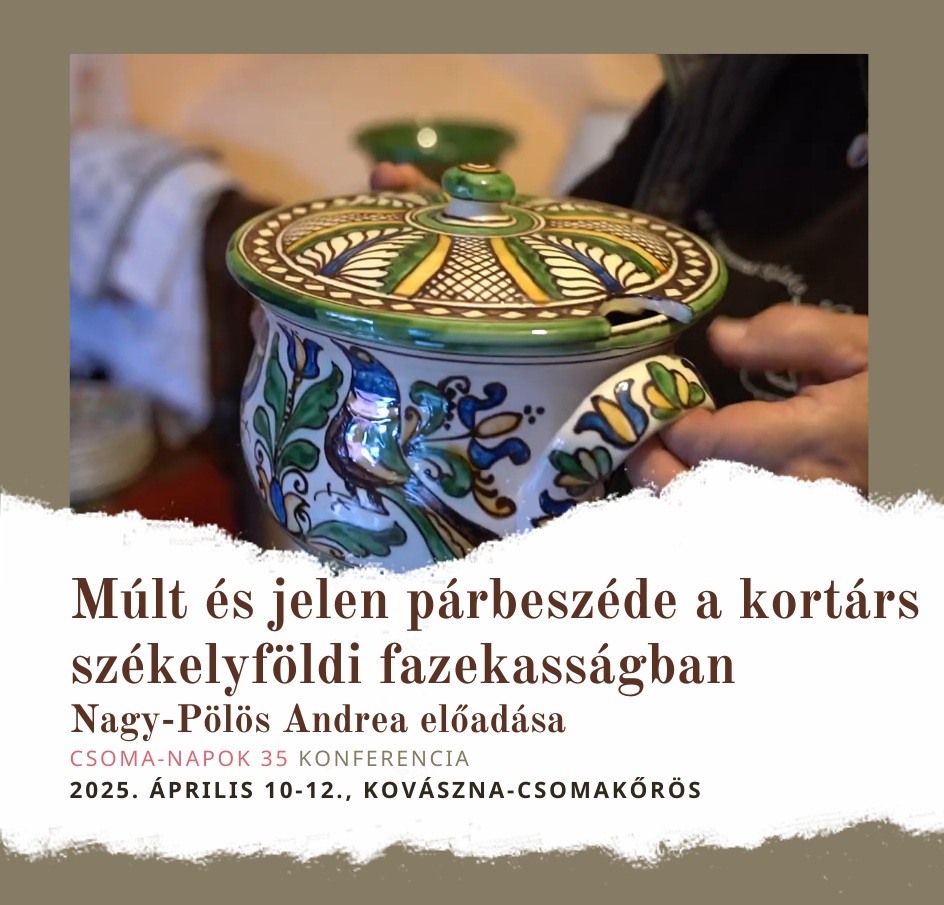 A hagyományos, népi eredetű és használati kerámiakészítés a 21. században Erdélyben is új kihívásokkal kénytelen szembenézni, mert sem az igények, sem a képzési lehetőségek nem hatnak a régi anyaghasználat és termelés irányába. Hogyan viszonyul a székelyföldi fazekasság a múlthoz? Hogyan lehet megőrizni a hagyományos székelyföldi fazekasság értékeit úgy, hogy egyúttal a kortárs kihívásoknak is megfeleljen? A helyzet áttekintése után a lehetséges megújítás és továbbvitel pozitív példáit mutatom be előadásomban.