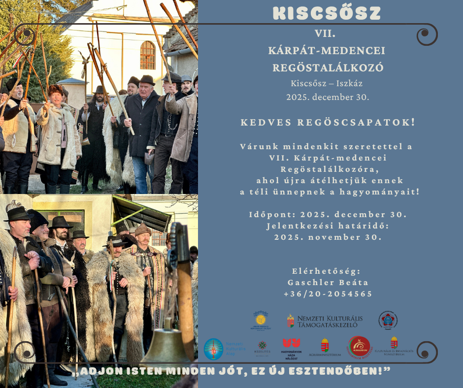 A Hunyor Népfőiskola (Élő Forrás Hagyományőrző Egyesület) szeretettel hívja és várja a Kárpát-medence regöscsapatait a VII. Kárpát-medencei Regöstalálkozóra, amely 2025. december 30-án kerül megrendezésre Kiscsőszön és Iszkázon.