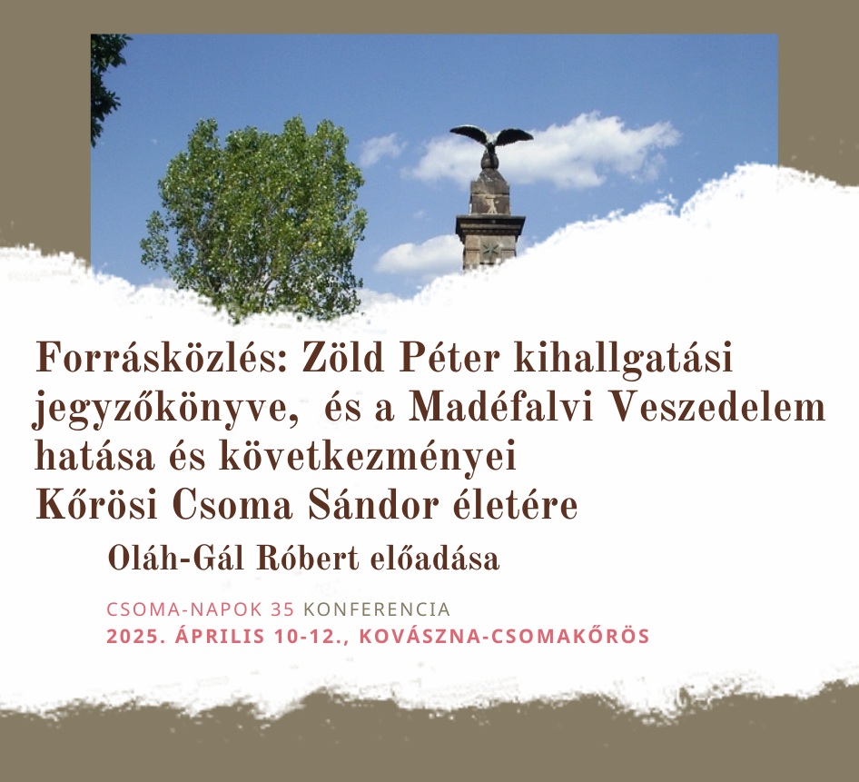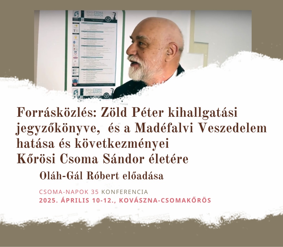 "Előadásomban röviden ismertetni szeretném (forrásközleményként) Zöld Péter kihallgatási jegyzőkönyvét. Majd azt az igen vitatatható kérdést boncolgatom, hogy a Madéfalvi Veszedelem milyen hatással volt Kőrösi Csoma Sándor életére.