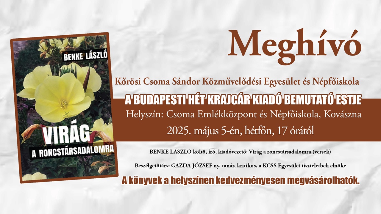 A Kőrösi Csoma Sándor Közművelődési Egyesület és Népfőiskola szeretettel vár minden érdeklődőt 2025. május 5-én, hétfőn 17 órától a Piliske utca 2. szám alatti Csoma Emlékközpont és Népfőiskola épületébe, ahol „Virágok a roncstársadalomra” címmel kerül sor irodalmi estre, a budapesti Hét Krajcár Kiadó bemutatkozásával.